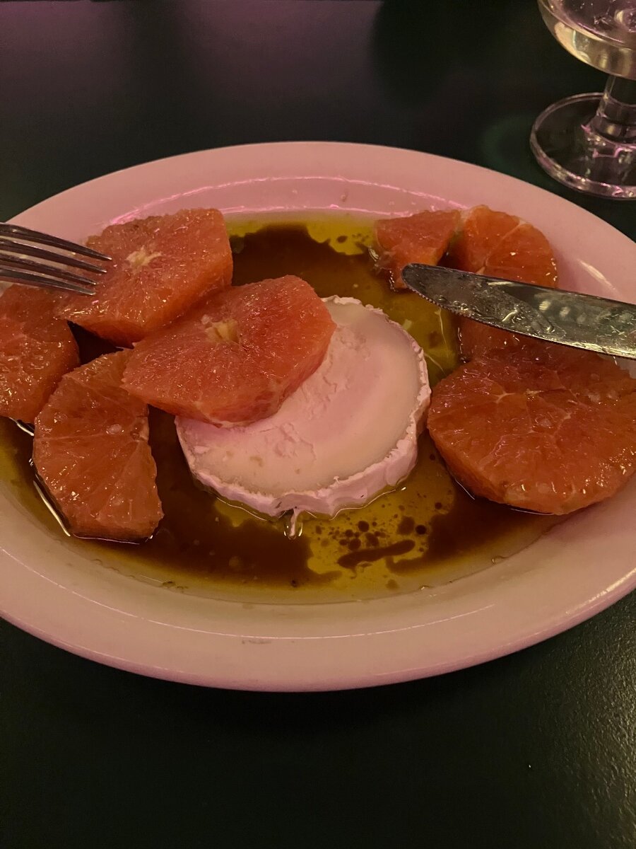 I had been curious about this place from the owners of Cervo's. Basque-style tapas it said. Also I was out of cheese, and it occurred to me that a visit to Eel Bar is easily paired with shopping at Formaggio Essex. It's larger inside than I expected, with a long and very comfortable bar. I did make a reservation and when I first walked in I thought I needn't have bothered; but the place filled up fast. The "wet martini" features gin, Dolin dry vermouth, Comoz Blanc (another vermouth) and orange bitters. It was good with the gildas, made here with pickled cucumber instead of the traditional pepper plus big, fat olives. I wasn't sure about the cara caras with Murcian goat cheese, but I'm glad I tried the dish. The cara cara is a red-fleshed orange but not a blood orange (per Wikipedia). The pieces were dusted with sea salt and served alongside the creamy cheese, over a dressing made with good vinegar. Interesting and thoughtful although the portion of oranges was unnecessarily generous. Like most NYC tapas, really a plate for sharing. Then the ambitious burger. A medium rare but crisply charred patty served with Roquefort (now over $50 per lb at Formaggio, incidentally), a couple of boquerones and a mound of thinly sliced raw onion. Boquerones do enhance red meat, but I had to remove most of the onions. Otherwise very good. I moved from the martini to a Catalunyan orange. Intriguing food, delightful service, nice room.